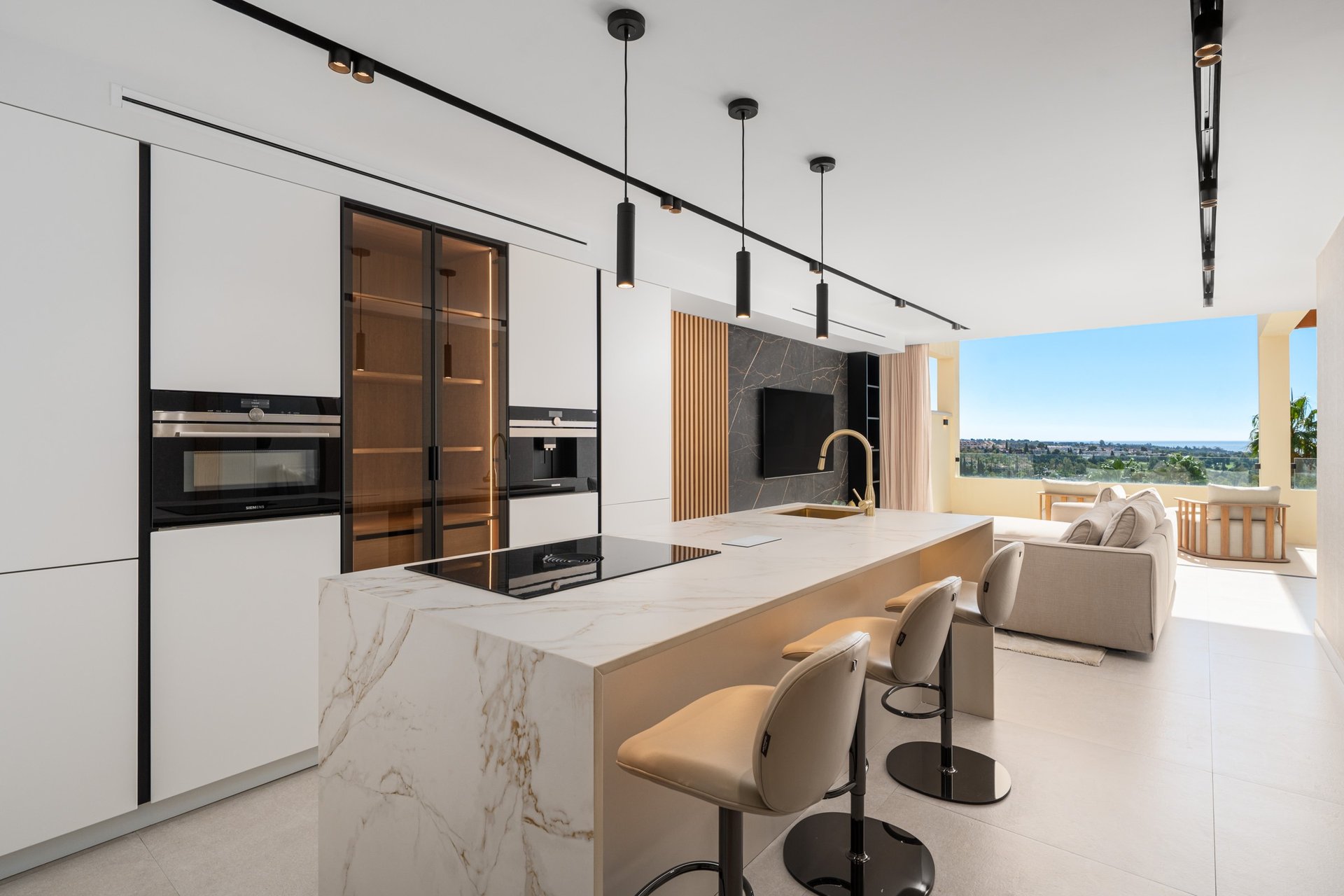 Apartment Jasmine is a beautifully refurbished three-bedroom property available for purchase in the exclusive Palacetes Los Belvederes, a well-established residential area in Nueva Andalucía. Originally constructed in 2003 and completely modernized in 2024, this southeast-oriented property provides 170 m² of meticulously designed living space, which includes 146 m² of stylish interiors and a 24 m² private terrace offering panoramic views of La Concha mountain, the Mediterranean Sea, and a tranquil lake.